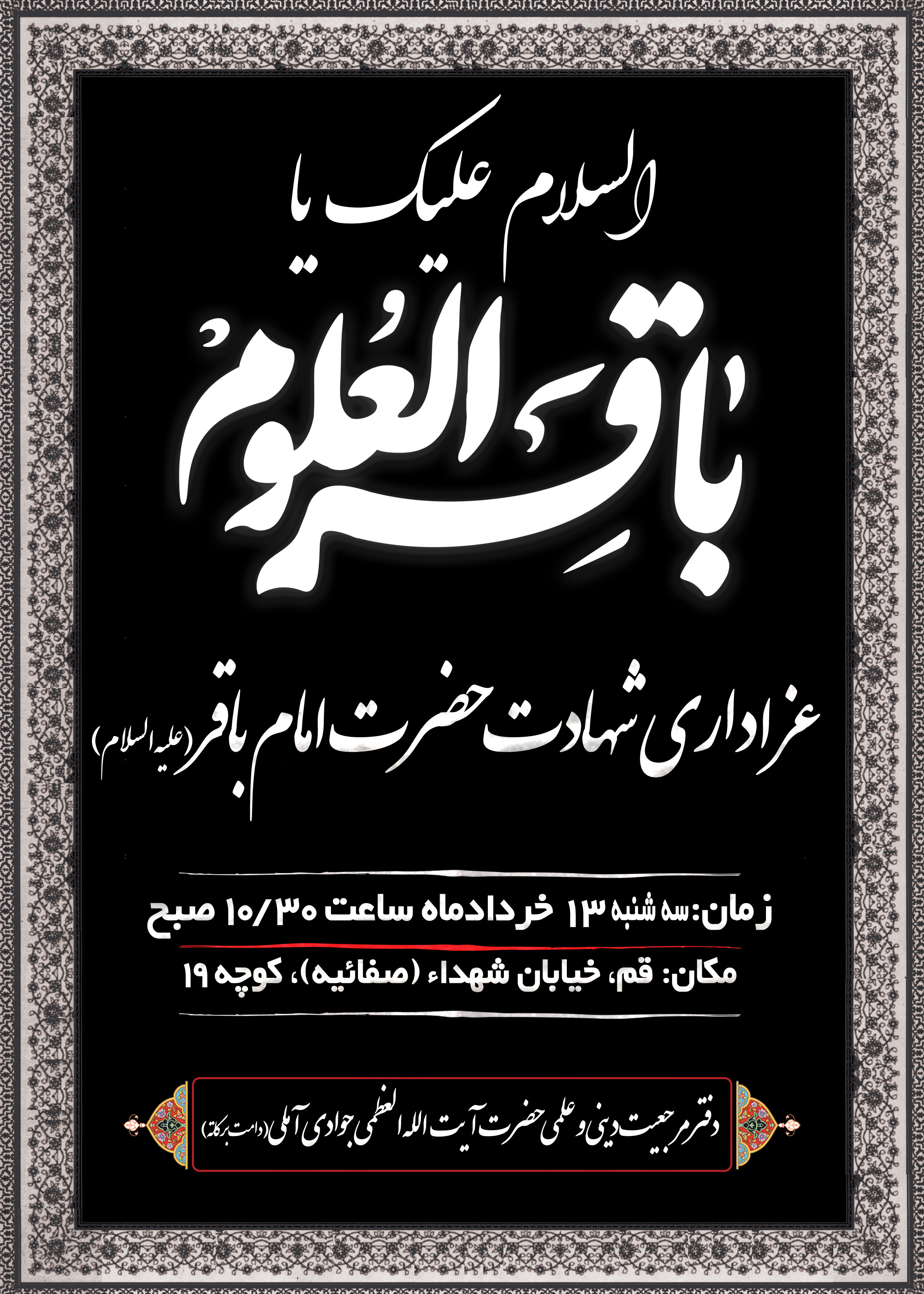 به مناسبت فرا رسیدن سالروز شهادت حضرت امام باقر سلام الله علیه ،مجلس توسل و عزاداری در دفتر حضرت آیت الله العظمی جوادی آملی در قم برگزار میگردد.