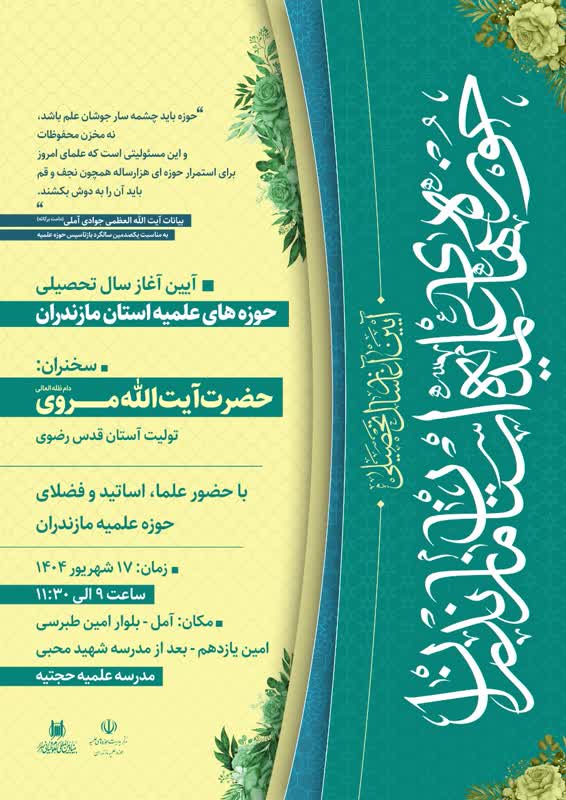 پایگاه اطلاع رسانی اسراء: آئین آغاز سال تحصیلی حوزه های علمیه استان مازندران با سخنرانی حضرت آیت الله مروی ( تولیت آستان قدس رضوی) در حوزه علمیه حجتیه در آمل برگزار می گردد.