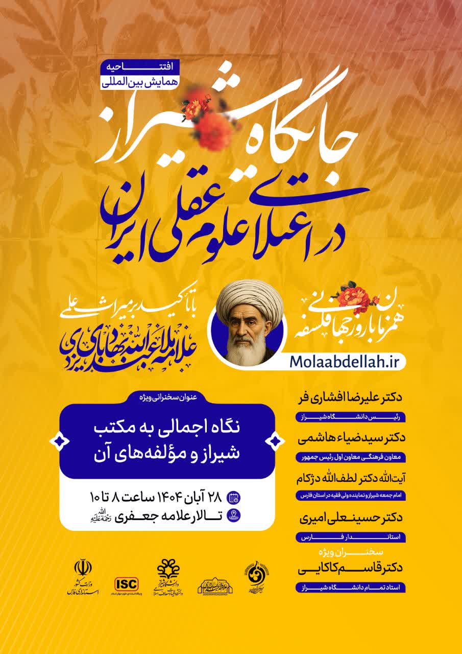پایگاه اطلاع رسانی اسرا: همایش بینالمللی «جایگاه شیراز در اعتلای علوم عقلی ایران با تأکید بر میراث علمی علامه ملاعبدالله بهابادی یزدی» با حضور علما، اساتید، پژوهشگران و فرهیختگان استان فارس برگزار شد.